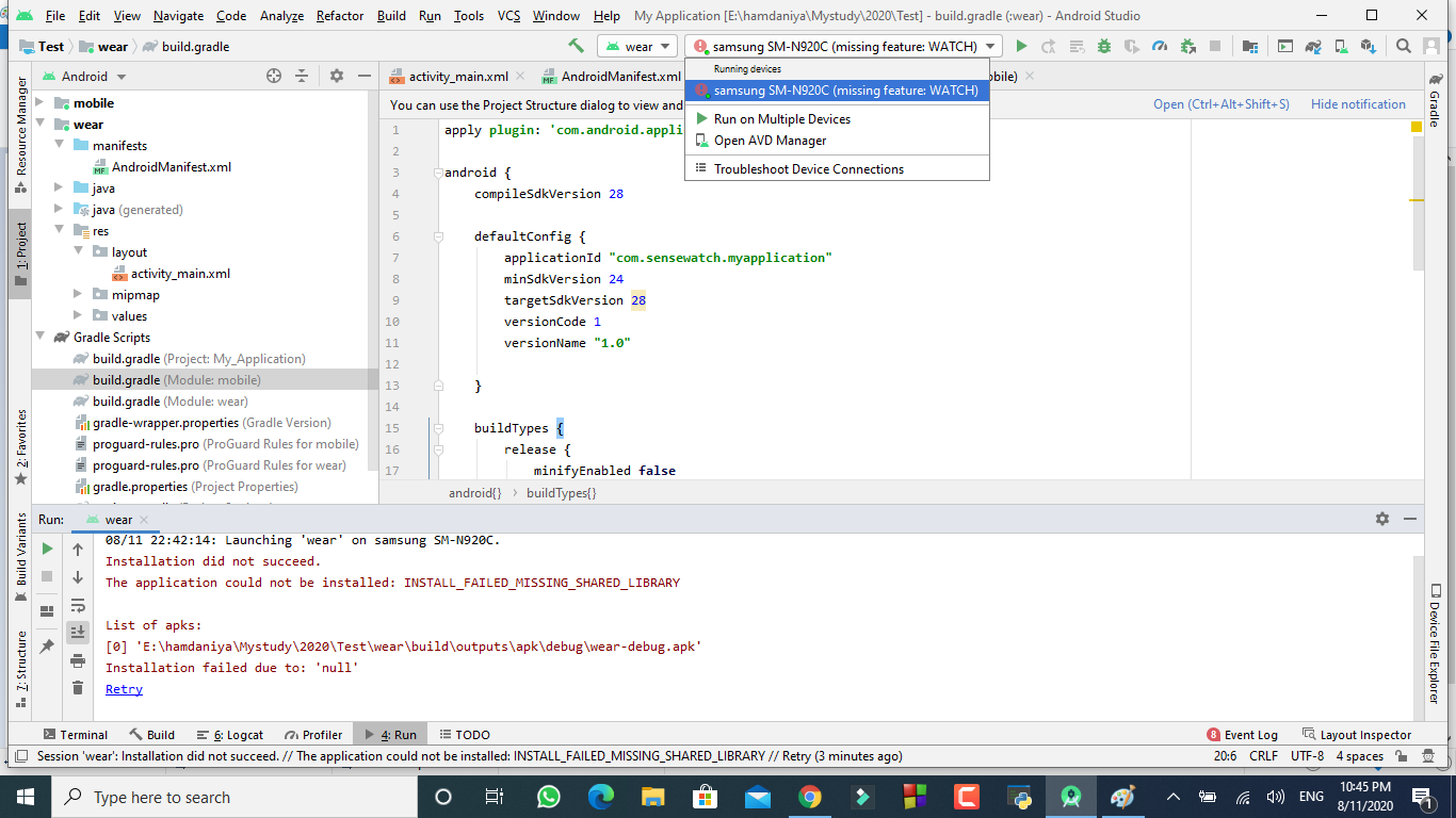 两天试图将hello world项目部署到银河活动2磨损中。它仍然显示缺少的特性:观看。该项目部署在我的手机正确,但当选择磨损一,它显示的信息:应用程序无法安装: INSTALL_FAILED_MISSING_SHARED_LIBRARY我已经阅读了相关的问题就像这里,,但无法解决它,这里是一个屏幕截图的磨损sdk。Mobile sdk是:
