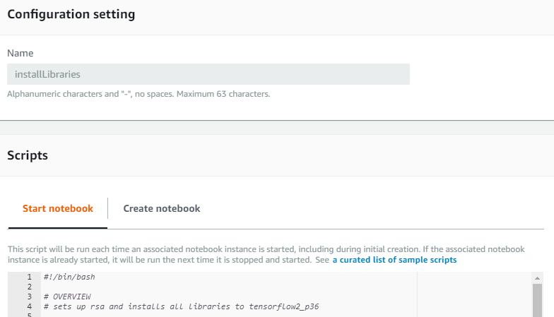 我正在尝试为一个SageMaker草图设置一个启动生命周期配置(它只是一个.sh文件),看起来,不管我做什么,我的笔记本在启动时超时。我尽可能地简化了所有的事情,到了除了#!/bin/bash之外的全部注释的程度,而且我仍然有一个超时。查看cloudwatch,这会显示在日志中: