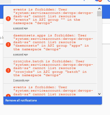 Error from server (Forbidden): pods is forbidden: User "system:serviceaccount:devops:devops-dash-sa" cannot list resource "pods" in API group "" in the namespace "default"