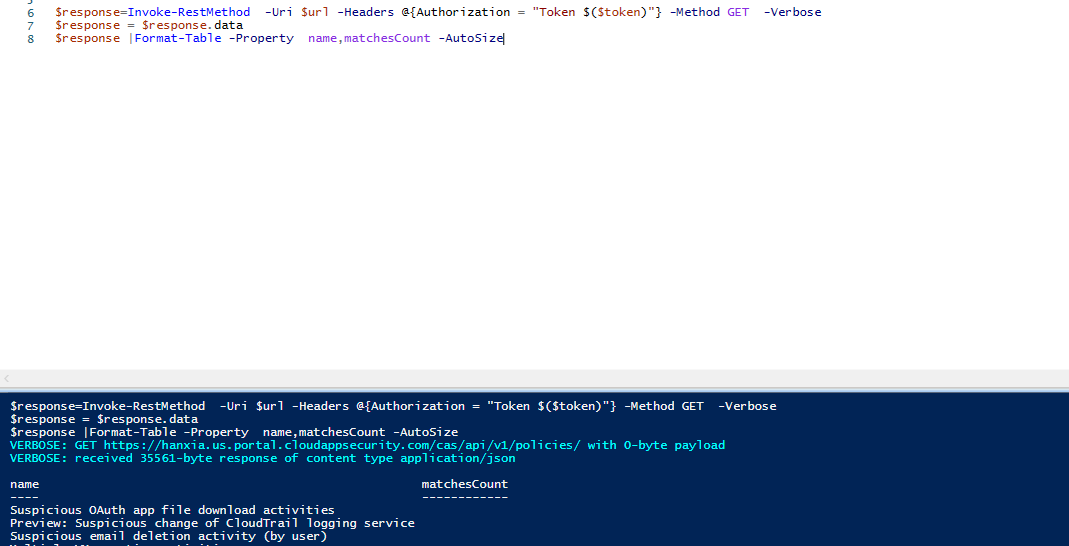 Invoke-RestMethod -Uri "https://xxx.yyyy.portal.cloudappsecurity.com/cas/api/v1/policies/" -Headers @{Authorization = "Token XXXXXXXXXXXXXXXXXXXX"} -Method GET -Verbose我正在寻找一个代码来提取使用API为策略指定的治理操作细节