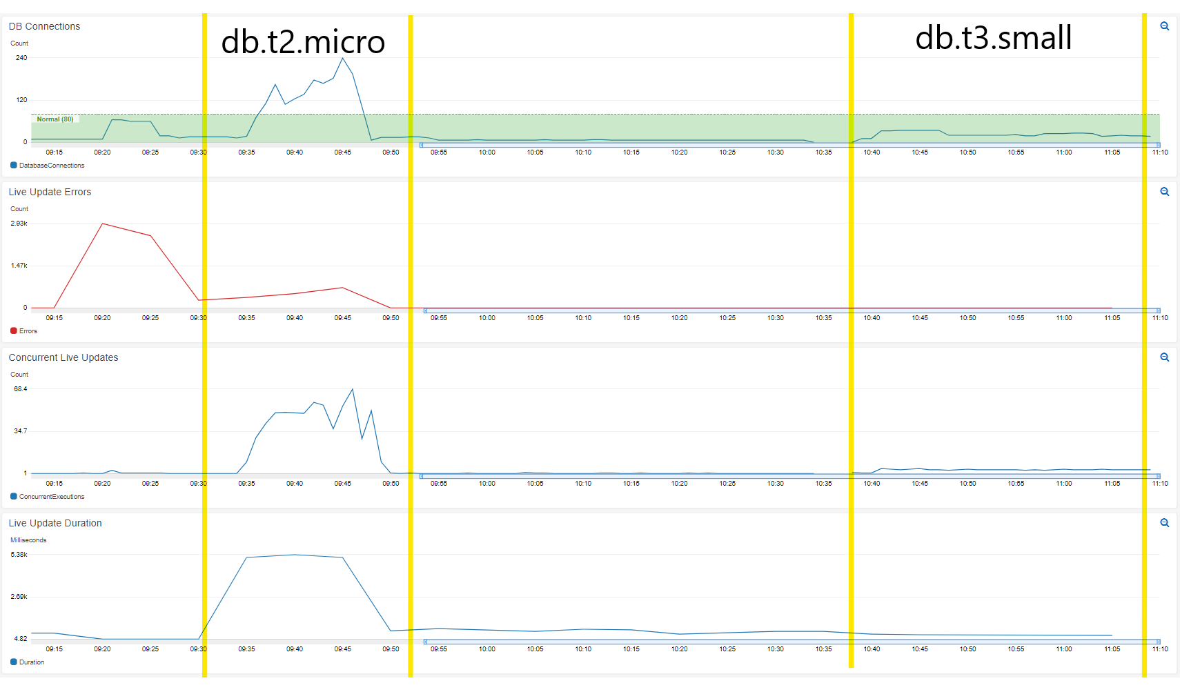 这继续取得很好的效果。令我印象深刻的是,双倍的DB资源似乎提供了> 2x的性能。现在,由于加载(或开发过程中的临时错误),db处理的数据库连接非常高(甚至超过1k)。我根本没有看到任何与数据库连接超时或数据库因加载而陷入困境的问题。从编写最初的时候起,我就添加了几个CPU密集型查询,以支持报告工作负载,并且它继续同时处理所有这些负载。
