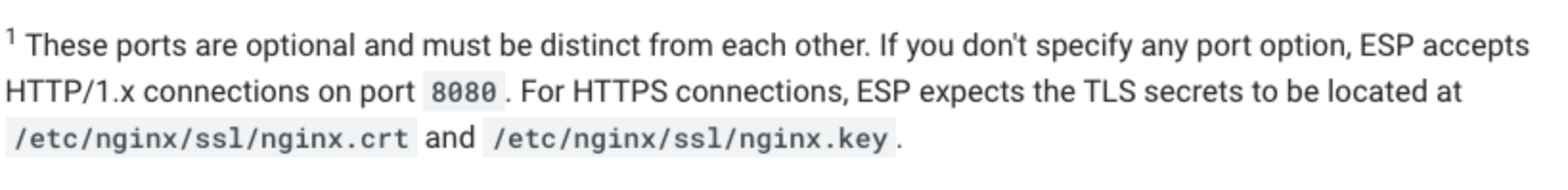 但是,我似乎无法找到在ESP上启用SSL的方法。正式文件说要从证书文件中创建一个秘密。然而,由于谷歌提供的证书,我不知道如何从它创建一个秘密。我可以在其他来源上找到的所有提示和注释都在使用自签名证书和/或证书管理器,如:https://github.com/GoogleCloudPlatform/endpoints-samples/issues/52#issuecomment-454387373。