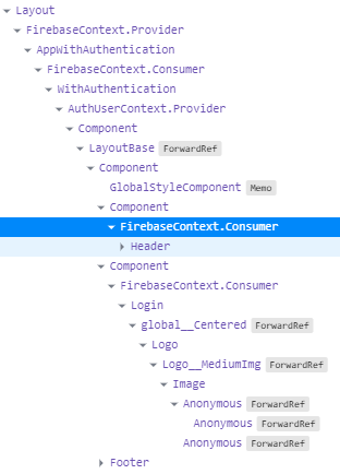 编辑:经过更多的测试后,我发现了一些更多的信息,但我仍然被困住了。在重新加载我的页面时,Layout组件呈现2次,Header组件和AppWithAuthentication组件各呈现4次,而Login组件只呈现1次。这就是消费者不更新的原因吗?(但是,当Header组件的更新与AppWithAuthentication一样多时,它为什么得不到任何更新呢?)
