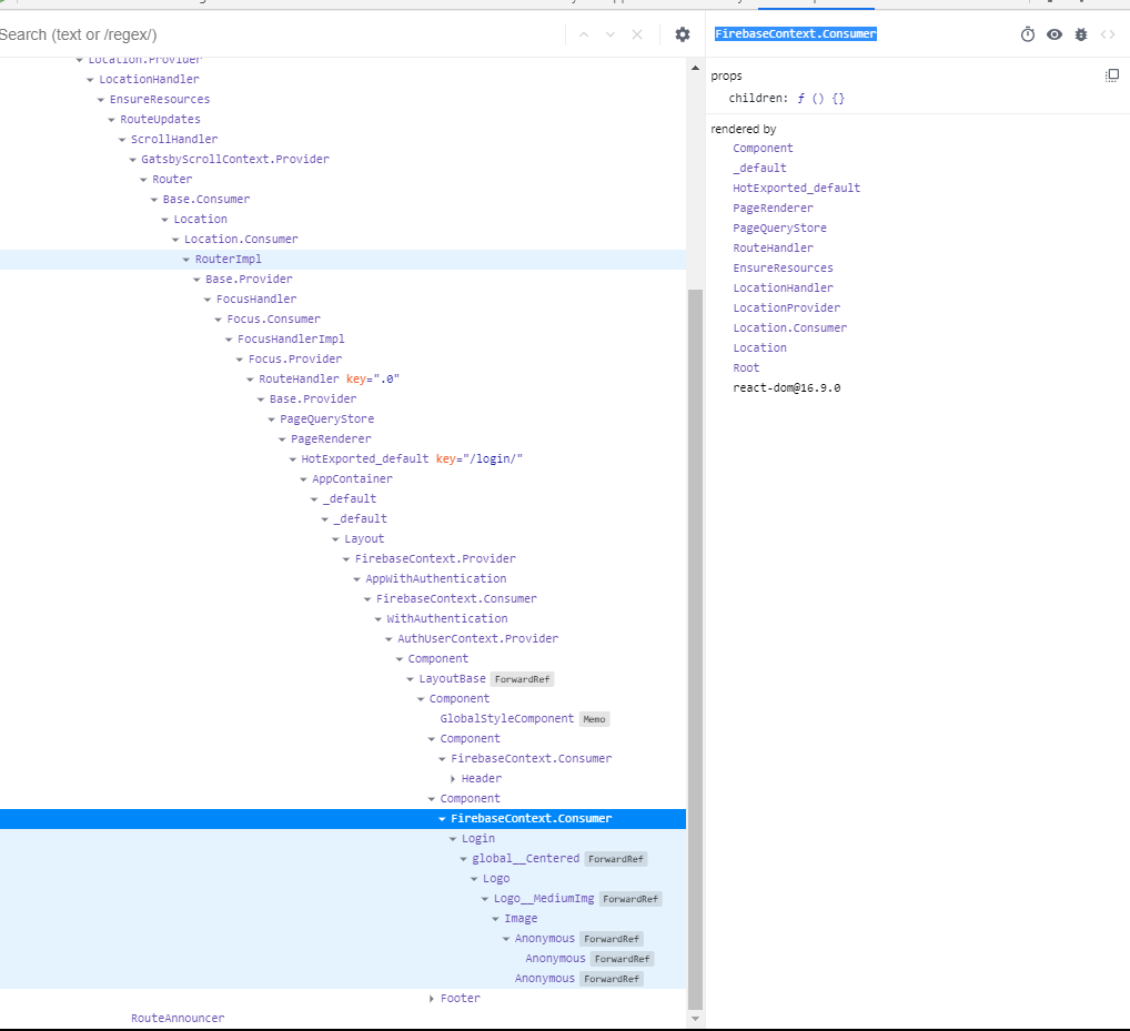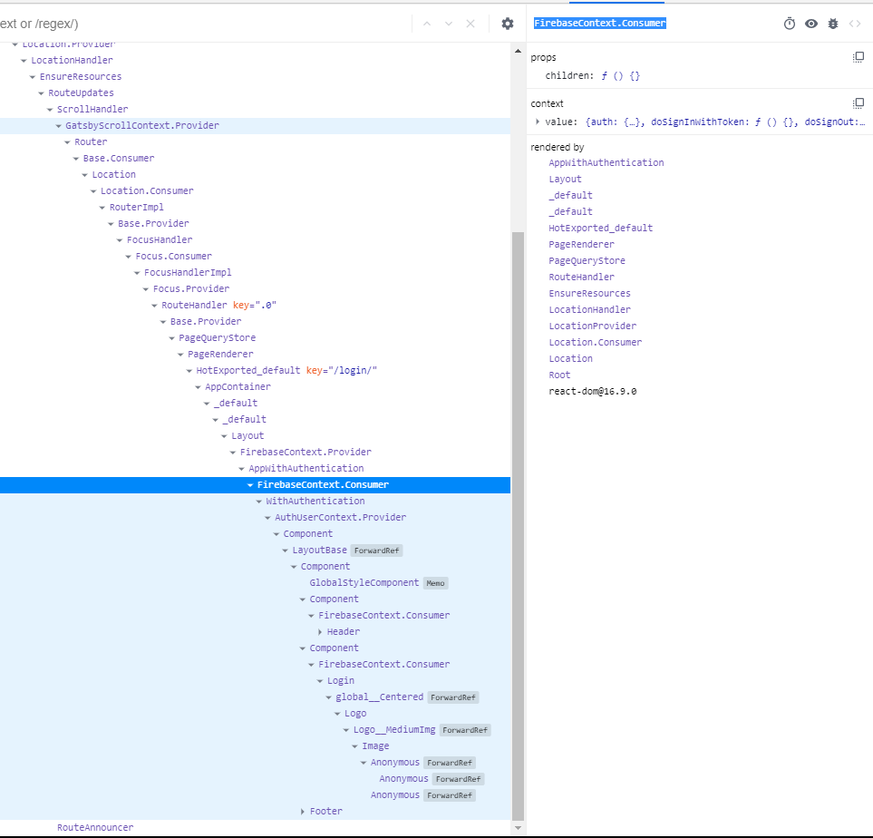 我甚至认为父母可能是在用更新的消费者进行渲染,但是孩子们并没有重新呈现,但是在计算了呈现和记录之后,很明显,我的应用程序中的组件渲染的次数比AppWithAuthentication还要多。为了使它更加清晰,下面是我的组件树(从页面根目录下的布局组件开始):