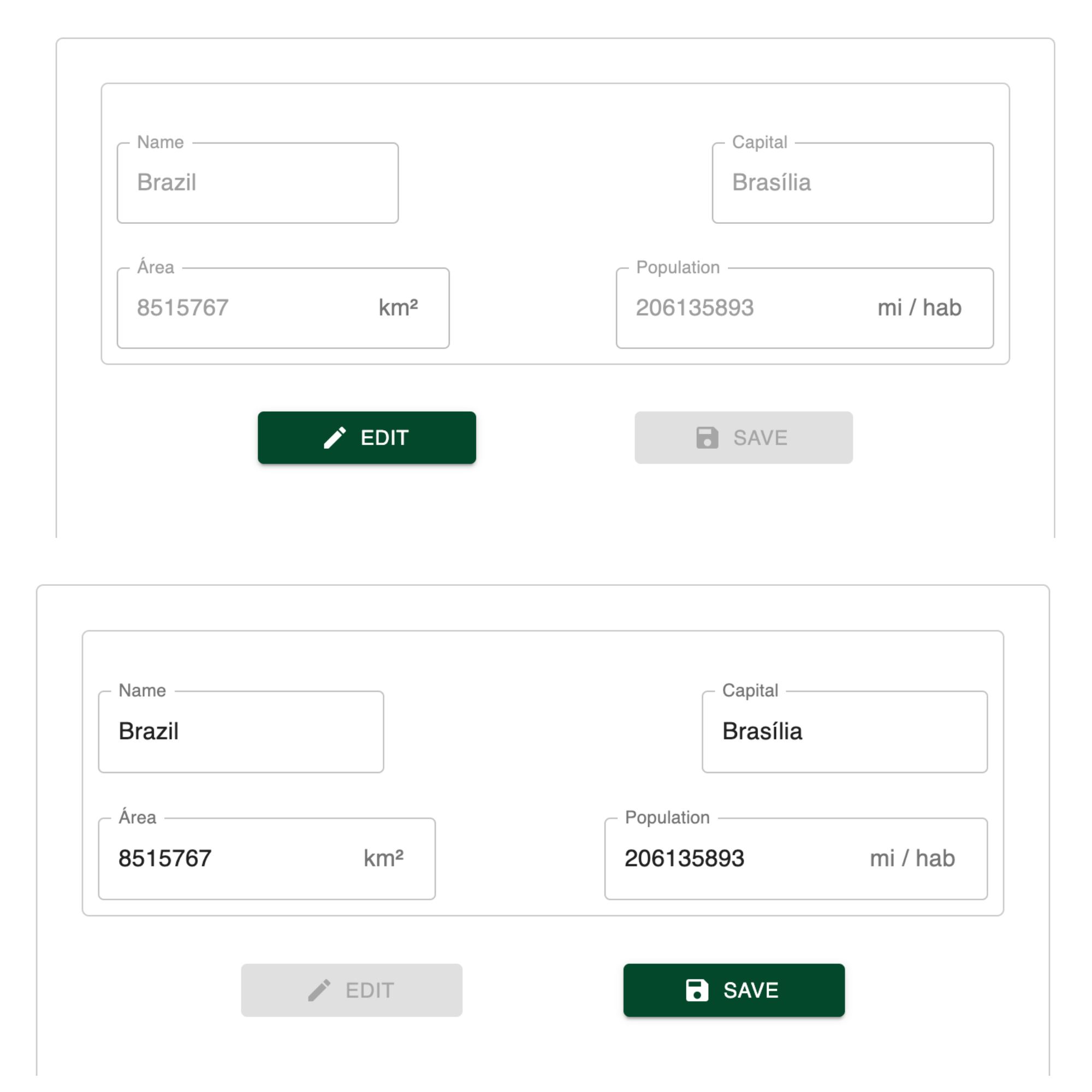 我有一份表格,里面有一个国家的数据。默认情况下,数据是只读的,如果用户希望更改值,请单击“编辑”按钮。
