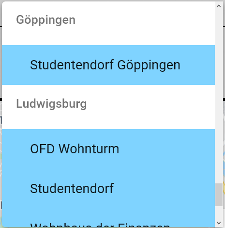 </mat-form-field>如果一个选项-组总是一个城市/休眠组(如“G ppingen”或“路德维格斯堡”),而这些选项是该城市的宿舍,如"Studentendorf G ppingen“或"OFD Wohnturm”。我想要的是城市也有蓝色的背景。