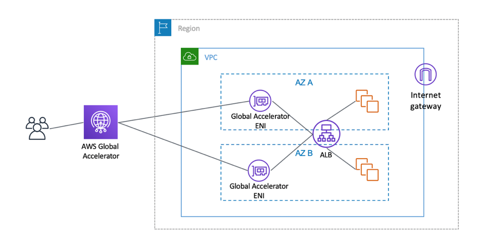 示例1:如果应用程序负载均衡器在subnetA和subnetB中具有弹性网络接口,然后将负载均衡器添加为加速器端点,全局加速器将创建两个弹性网络接口,每个子网中一个。