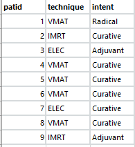 technique = c("VMAT", "IMRT", "ELEC", "VMAT", "VMAT", "VMAT", "ELEC", "VMAT", "IMRT")