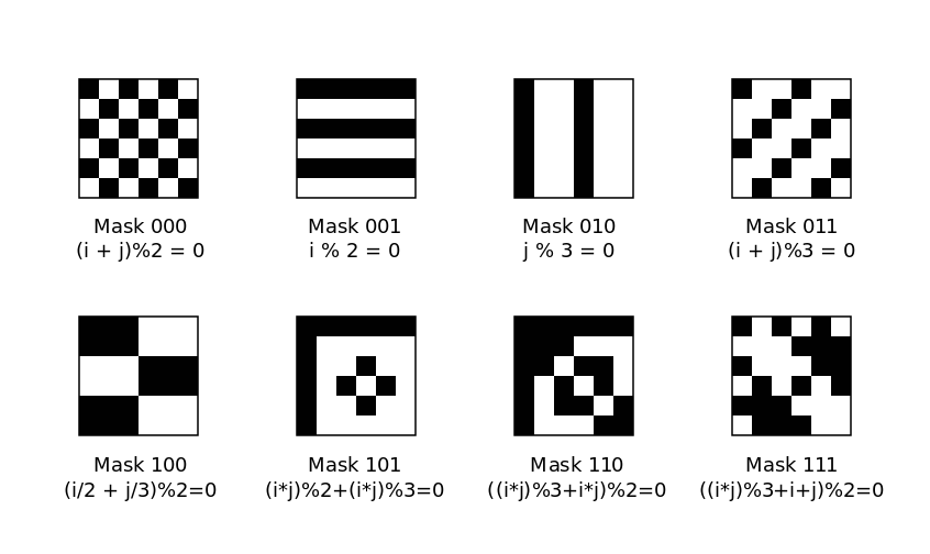 已经说明了为QR代码创建第一和第二掩蔽模式的规则,即: