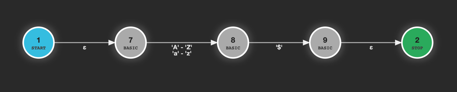 这是规则的ATN:LETTER: [a-zA-Z] '$';。它从ATN状态1开始,并有一个单epsilon过渡到第一个基本状态。其中一个有一个输出集,转换到另一个基本状态。从那里开始,原子转换到另一个中间状态,然后从那里到规则结束。