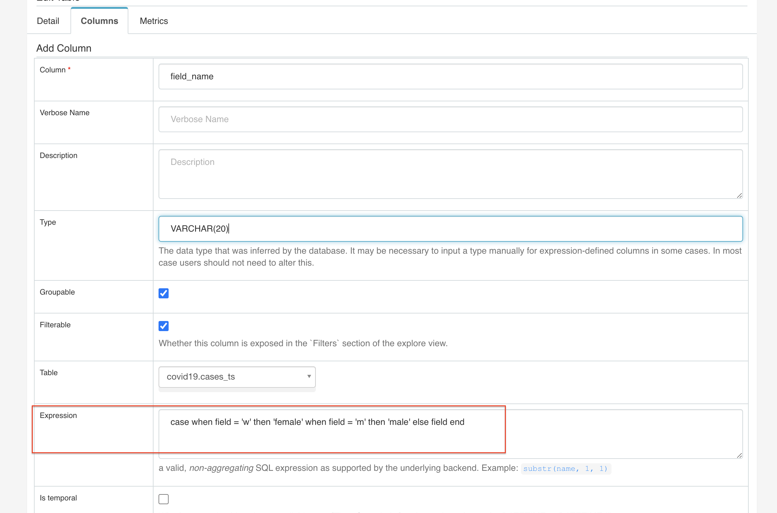正如Gordon提到的,您可以用一个案例来完成它,在Superset中,您可以在一个列的表达式中这样做,或者您可以创建一个虚拟列,就像在这个屏幕截图中一样。