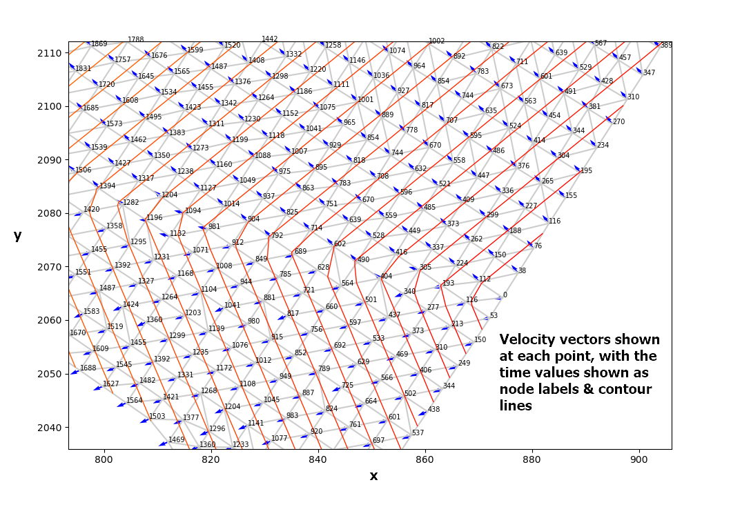 其中Vx,Vy阵列(速度分量向量)是输入,输出是数据点x,y处的反导数数组(到达时间)。