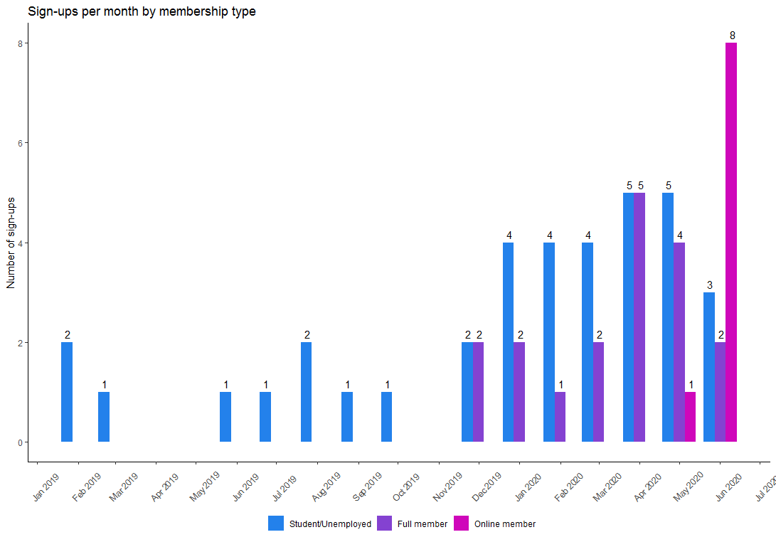 signupMT <- ggplot(SignupPM, aes(fill=`Membership type`, y=count_by_Name, x=month)) +