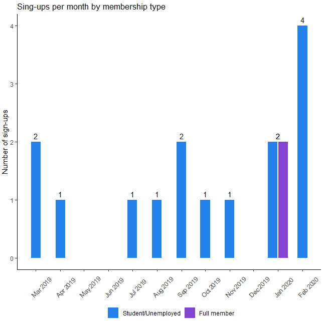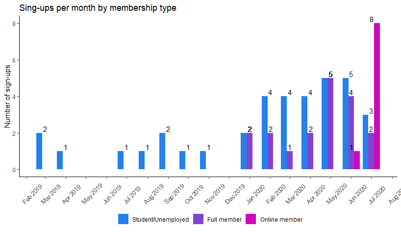 scale_fill_manual(values=c("#2381EB", "#8442D1", "#CF07BA"), name = NULL, labels = c("Student/Unemployed", "Full member", "Online member")) +