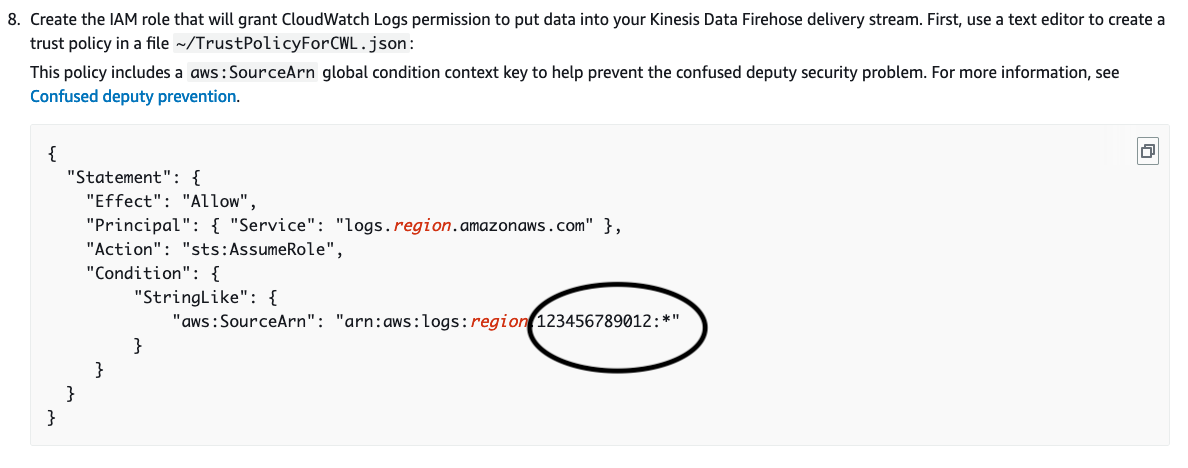 aws logs put-subscription-filter --log-group-name "myLogGroup" --filter-name "Destination" --filter-pattern "{$.userIdentity.type = Root}" --destination-arn "arn:aws:firehose:ap-southeast-1:1234567890:deliverystream/my-delivery-stream" --role-arn "arn:aws:iam::1234567890:role/CWLtoKinesisFirehoseRole"我已经检查了受信任的实体,角色已经私密地使用了日志和消防水管。有什么想法吗?