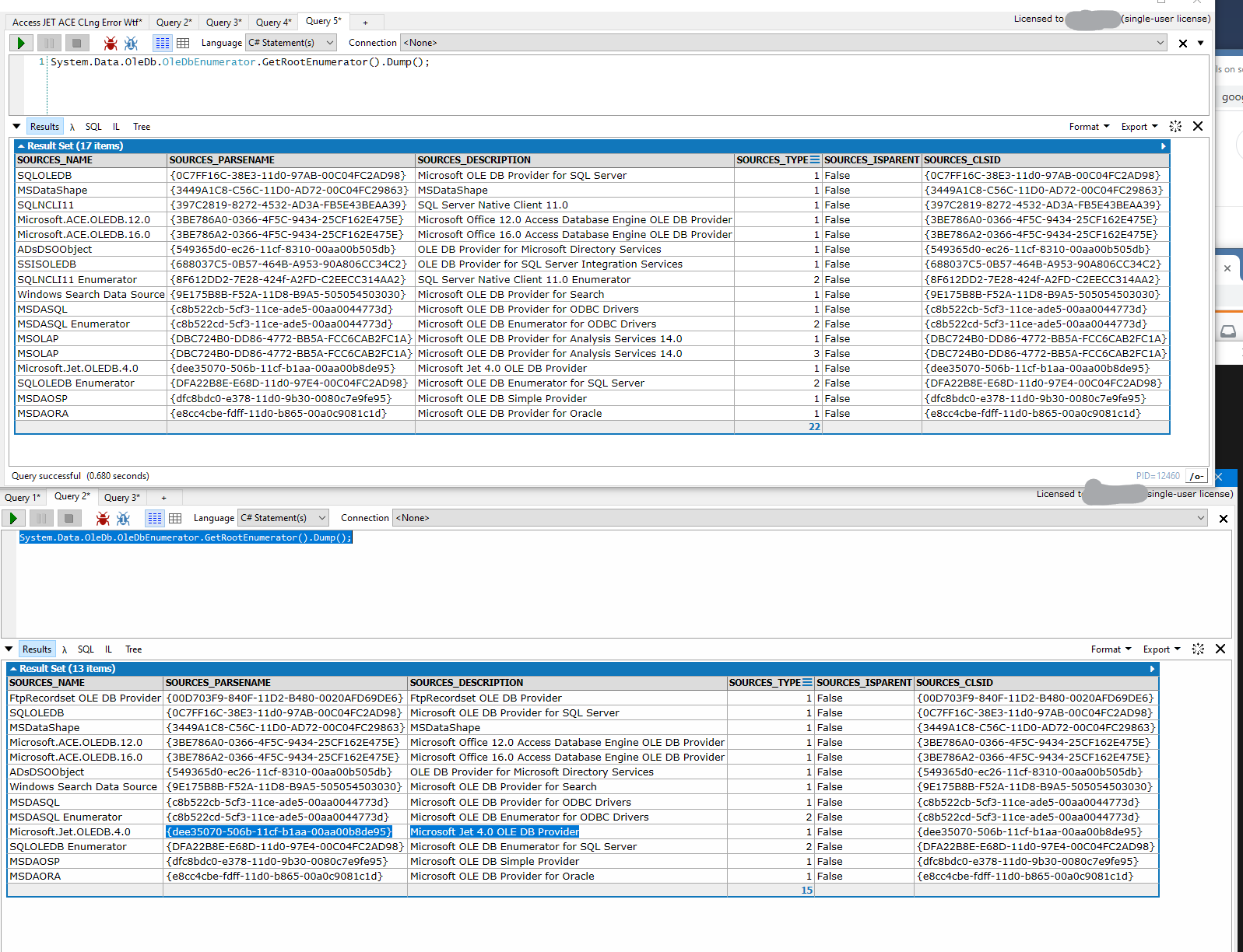 - When I use the `Microsoft.ACE.OLEDB.16.0` OLE-DB provider it succeeds.*.mdb数据库文件.当枚举32位OLE-DB提供程序时,两台计算机为JET和ACE驱动程序报告相同的信息(请参见下面的屏幕快照,我的计算机位于顶部,另一台计算机位于底部):