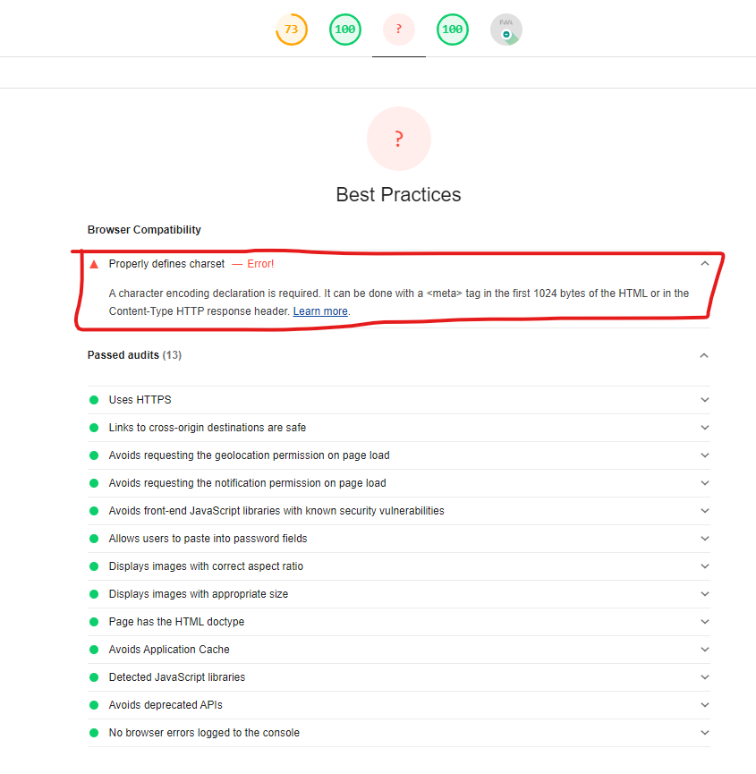 我有一个VueJs SPA应用程序。一切都很好。但是当我运行铬灯塔报告时,它会返回Properly defines charset错误。实际上,我在我的index.html文件中添加了字符集。