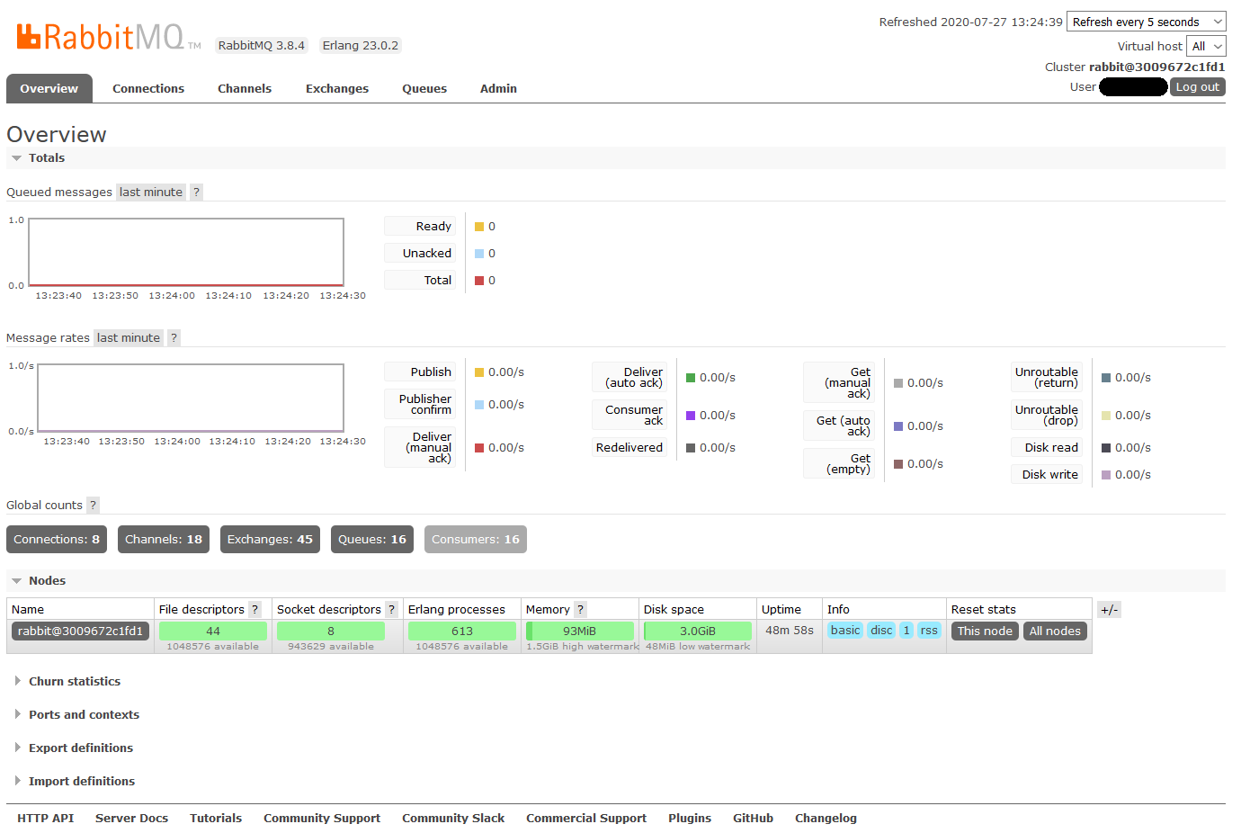 我们的一个测试部署服务器上的磁盘已满。它通常运行多个码头容器,其中一些使用rabbitmq进行通信(也作为容器运行,image :3.8-management)。在运行docker-compose down之后,大约3Gb的磁盘空间被释放,docker-compose up -d成功地启动了一切。