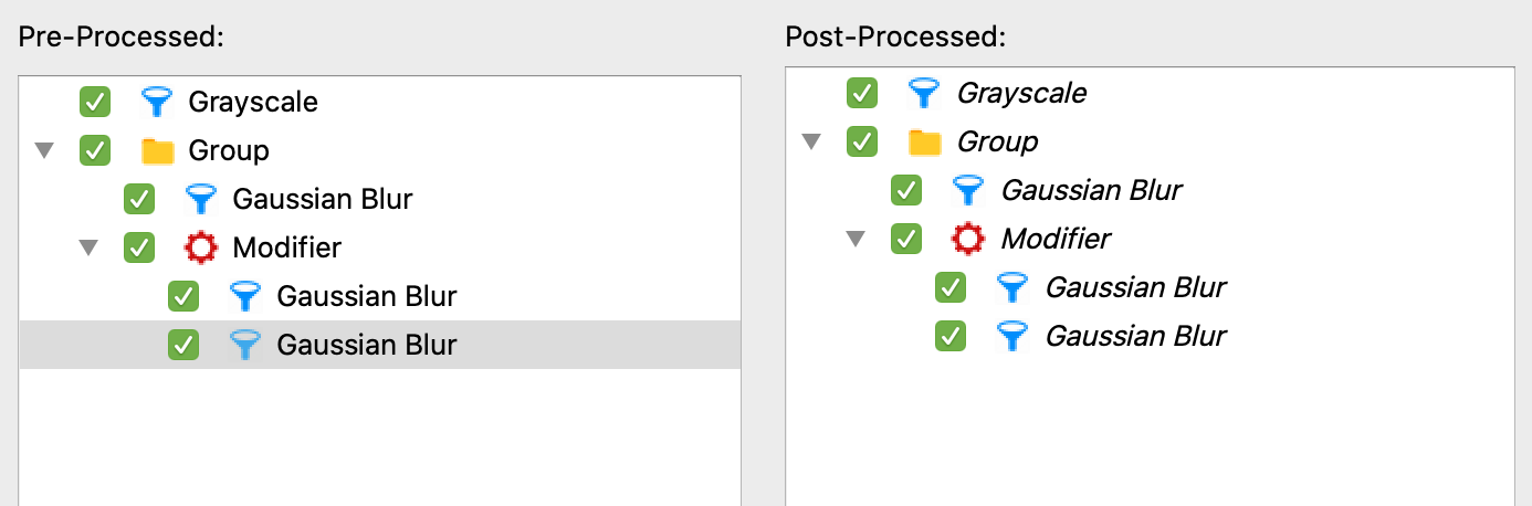 我在两个QTreeViews中显示了一个QTreeViews。第一个TreeView使用标准QStyledItemDelegate,不作任何更改,并显示带有复选框、图标和显示文本的项目。第二个视图应该显示相同的树,尽管QStyledItemDelegate的自定义实现应该执行以下操作: