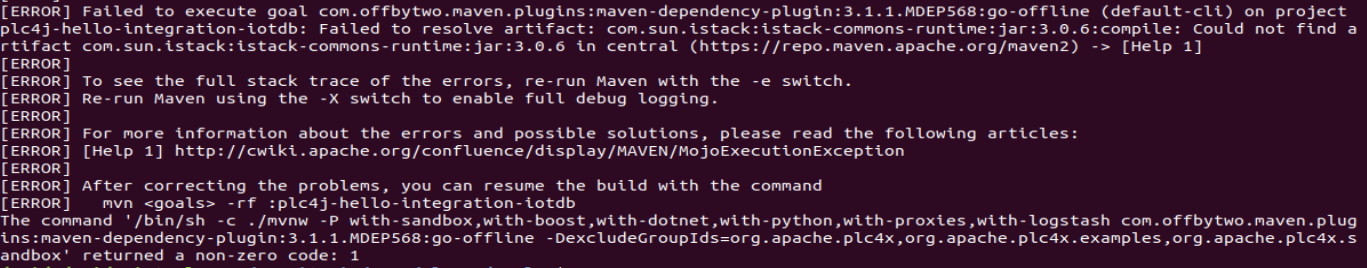 步骤20/36 :运行./mvnw -P with-sandbox,with-,with-dotnet,with-python,with-,with -DexcludeGroupIds=org.apache.plc4x,org.apache.plc4x.examples,org.apache.plc4x.sandbox -->在58f0d82652e1 /bin/sh: 1:./mvnw:权限被拒绝的命令'/bin/sh -c ./mvnw -P with-sandbox中运行,使用-python,with,with com.offbytwo.maven.plugins:maven-dependency-plugin:3.1.1.MDEP568:go-offline -DexcludeGroupIds=org.apache.plc4x,org.apache.plc4x.examples,org.apache.plc4x.sandbox‘返回一个非零代码:126个