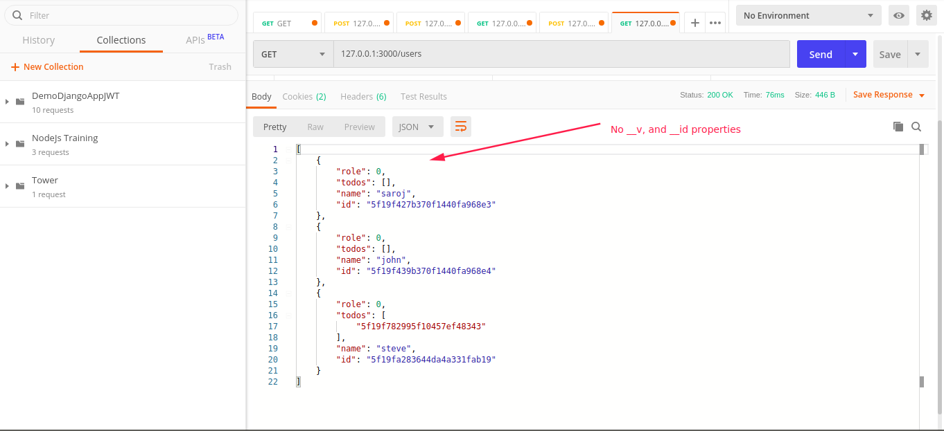 module.exports = mongoose.model("User", userSchema)我有一个user/,它简单地从我的DB中获取所有用户,它返回我所寻找的响应类型,其中没有__v和_id属性。