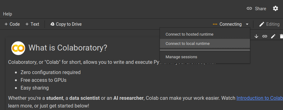 我的PC是一台2080 to,所以我真的不需要谷歌Colab的GPU计算,但我确实发现它是一个很好的开发环境(与jupyter笔记本相比),而且我喜欢我可以从任何地方访问我的文件,那么,是否可以使用Google,但让我的本地pc来计算呢?