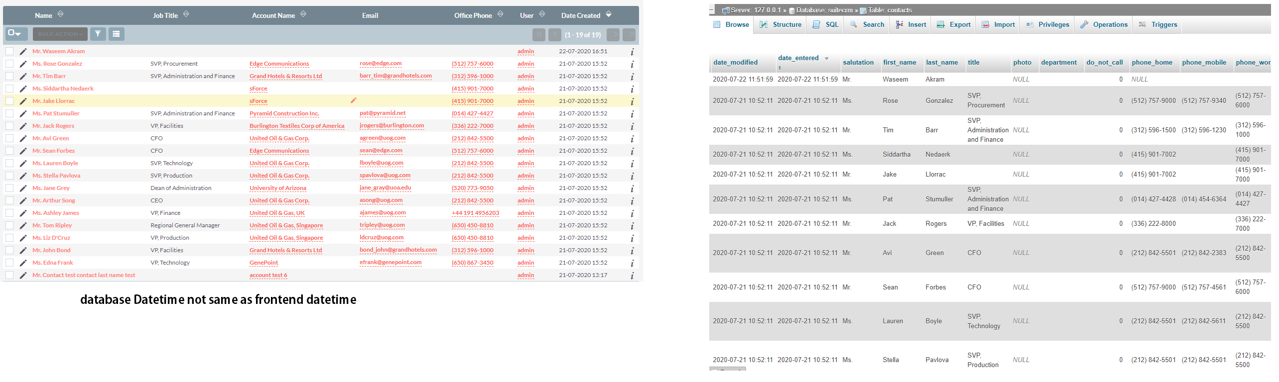 SuiteCRM我在SuiteCRM中面临时间问题。在SuiteCRM中,创建的日期与数据库中的日期不相同。同样,在报告和时间表中。我在以下文件/设置中更改了时区: