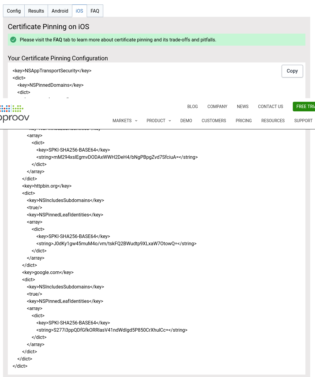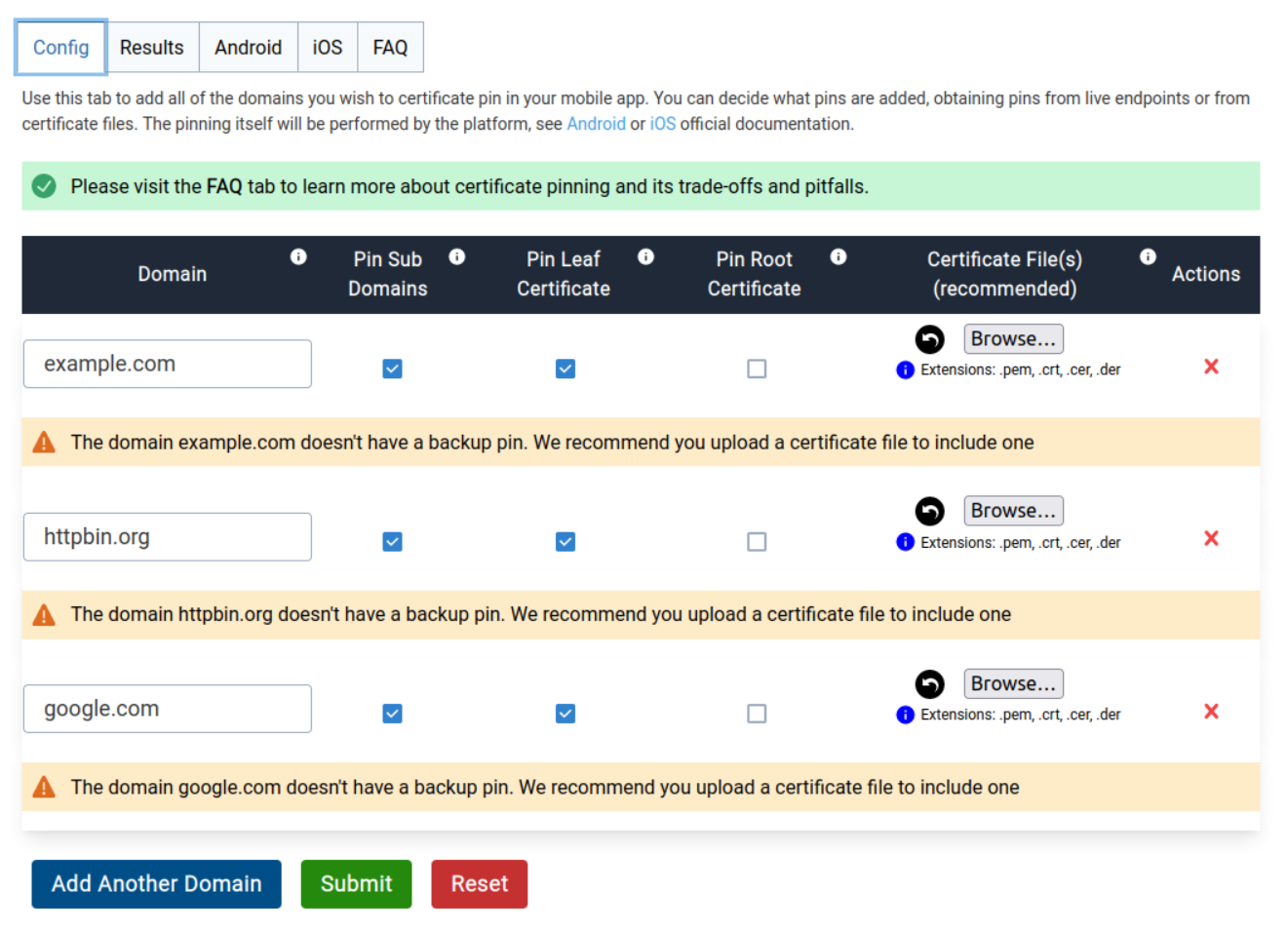 我将简化这种方法,只需针对每个后端服务器和移动证书钉扎发生器工具就可以帮助您提取多个域/ips的引脚,同时生成适合于安卓和iOS的固定配置。