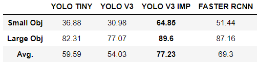我正在比较用于海上搜索和救援(SAR)目的的目标检测模型。从我使用的模型,我得到了最好的结果YOLOv3的改进版本的小对象检测和更快的RCNN。