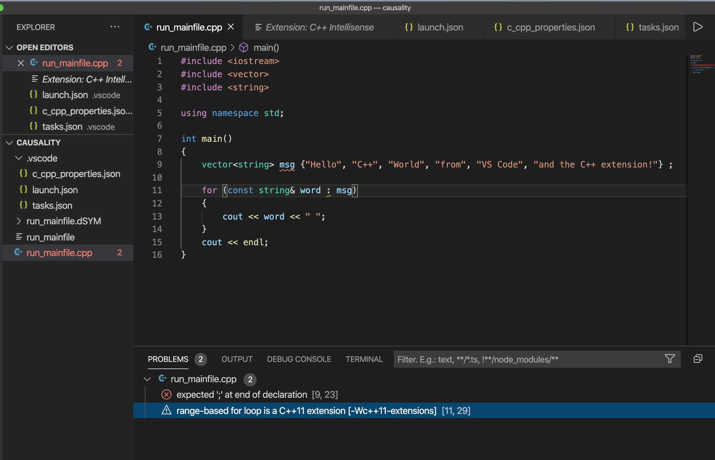 我遵循了这个网页上的教程:https://code.visualstudio.com/docs/cpp/config-clang-mac,以便能够使用VS代码编译c++程序。在完成所有要求的事情后,我能够编译和调试c++文件。