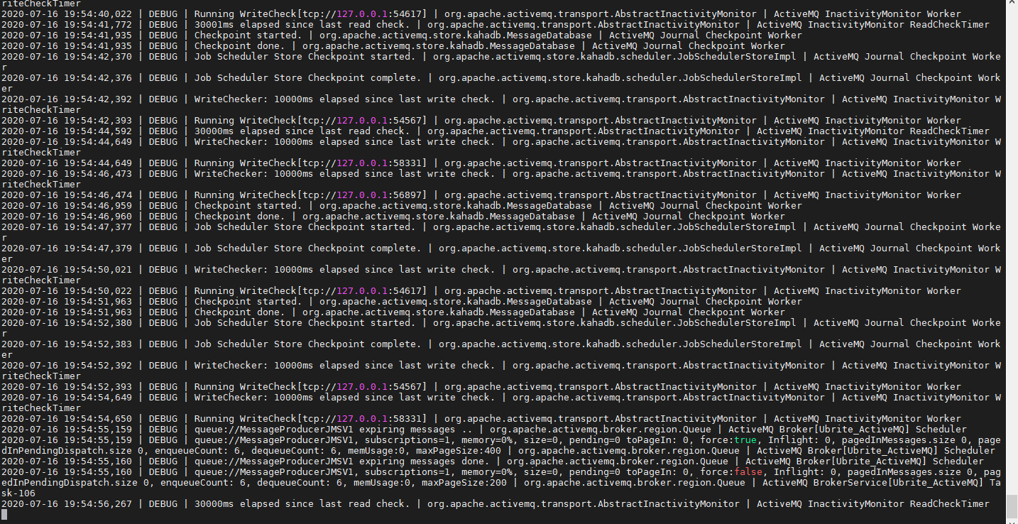 2020-07-16 19:48:54,648 | DEBUG | WriteChecker: 10000ms elapsed since last write check. | org.apache.activemq.transport.AbstractInactivityMonitor | ActiveMQ InactivityMonitor WriteCheckTimer