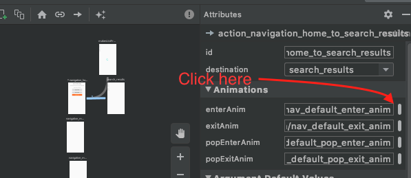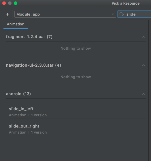 app:popExitAnim="@anim/slide_out_right" />但是,当我单击如下所示的属性时,在导航图资源的设计视图中,我只看到slide_in_left和side_out_right。为什么其他两个人不在?
