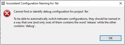 Cannot find or identify debug configuration for project 'lte' To be able to automatically switch between configurations, they should be named in a way that one (and only one) of them contains the word 'release' while the other contains 'debug'.我检查并验证了两个位置都存在liblte_dbg.dll,即“C:\omnetpp-5.5.1\liblte_dbg.dll\lte\src”和liblte_dbg.dll。