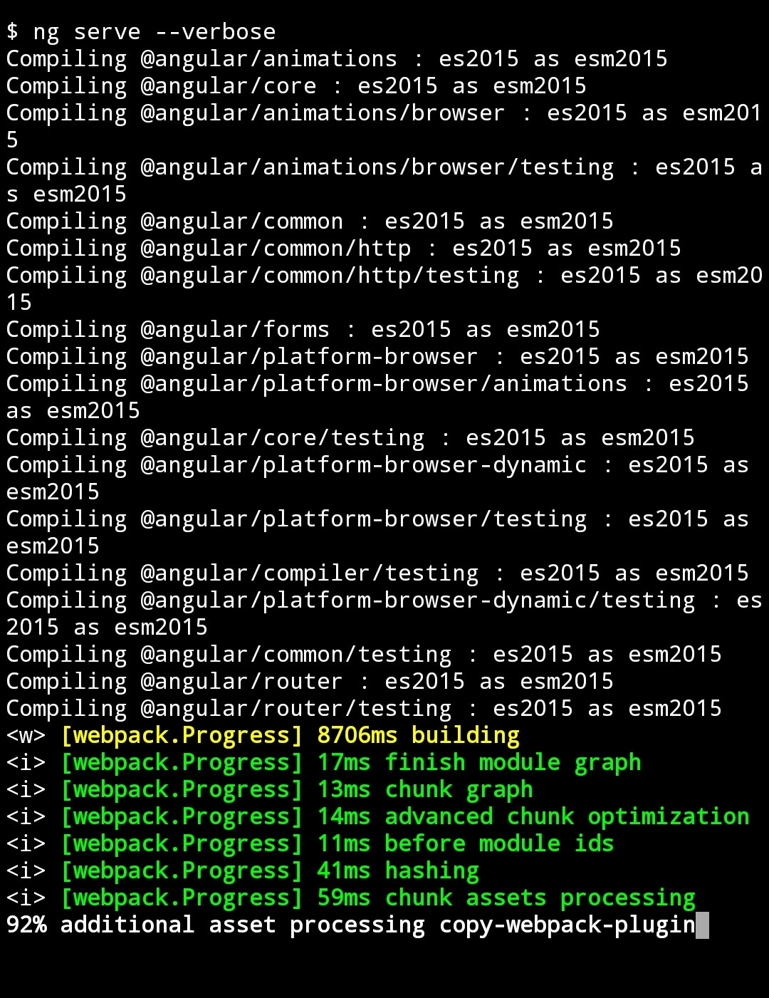 当我试图用我的android智能手机运行一个常规的角形10网络应用程序时,我在为应用程序服务时遇到了阻塞问题: ng服务器挂在复制资产上,显示:"92%处理附加资产复制-webpack-plugin“。