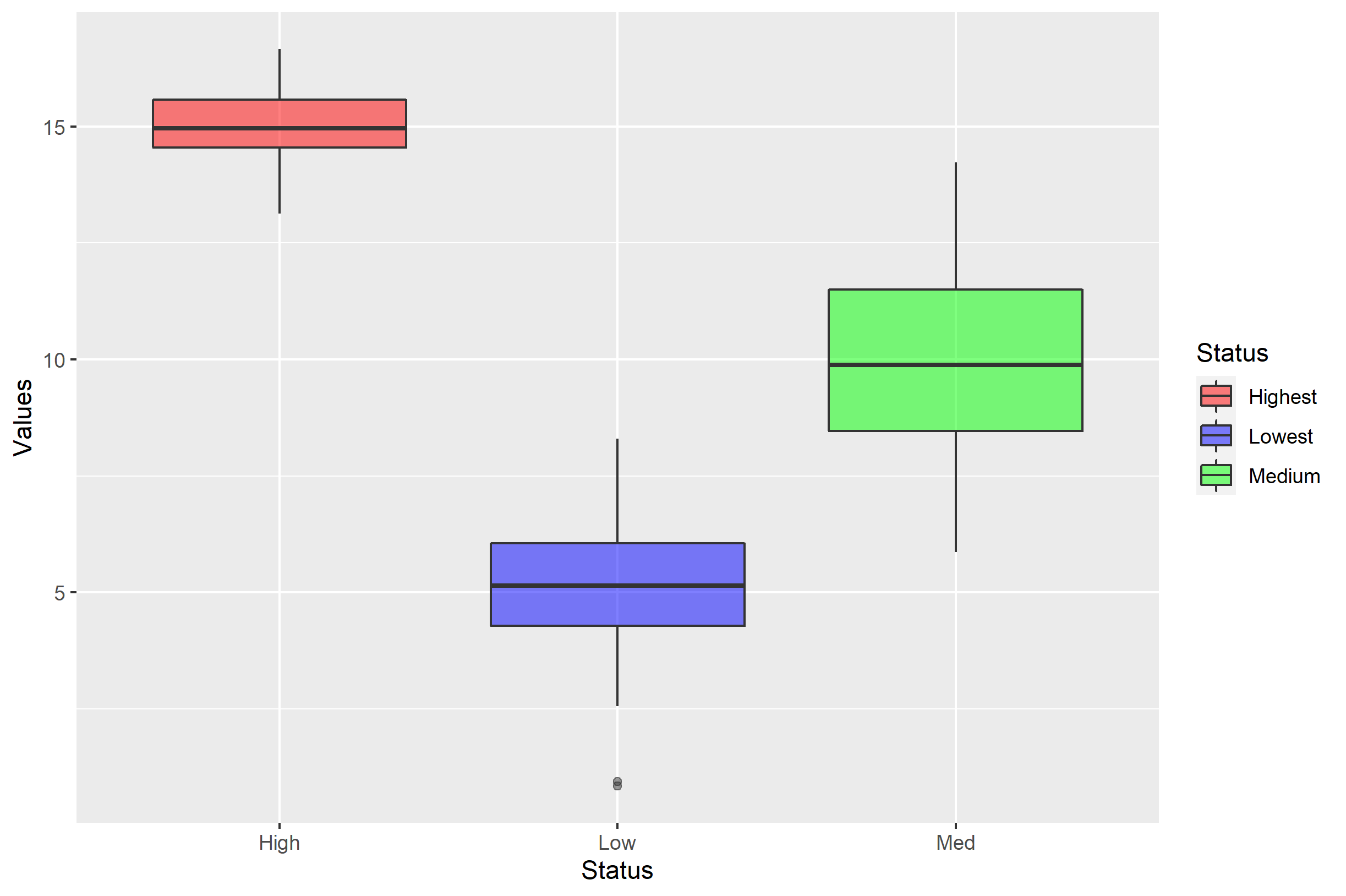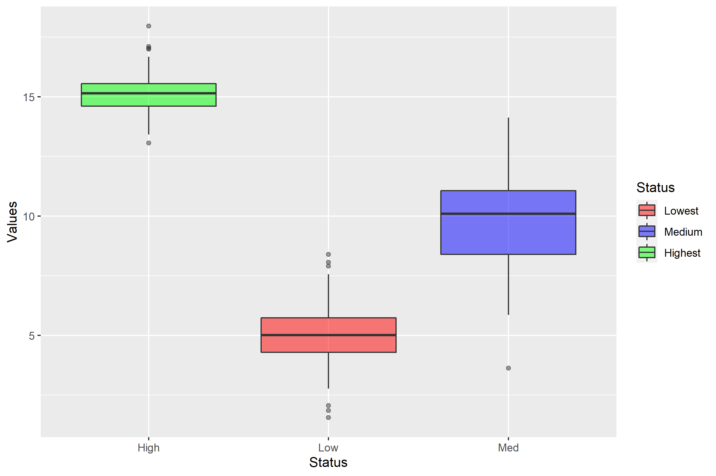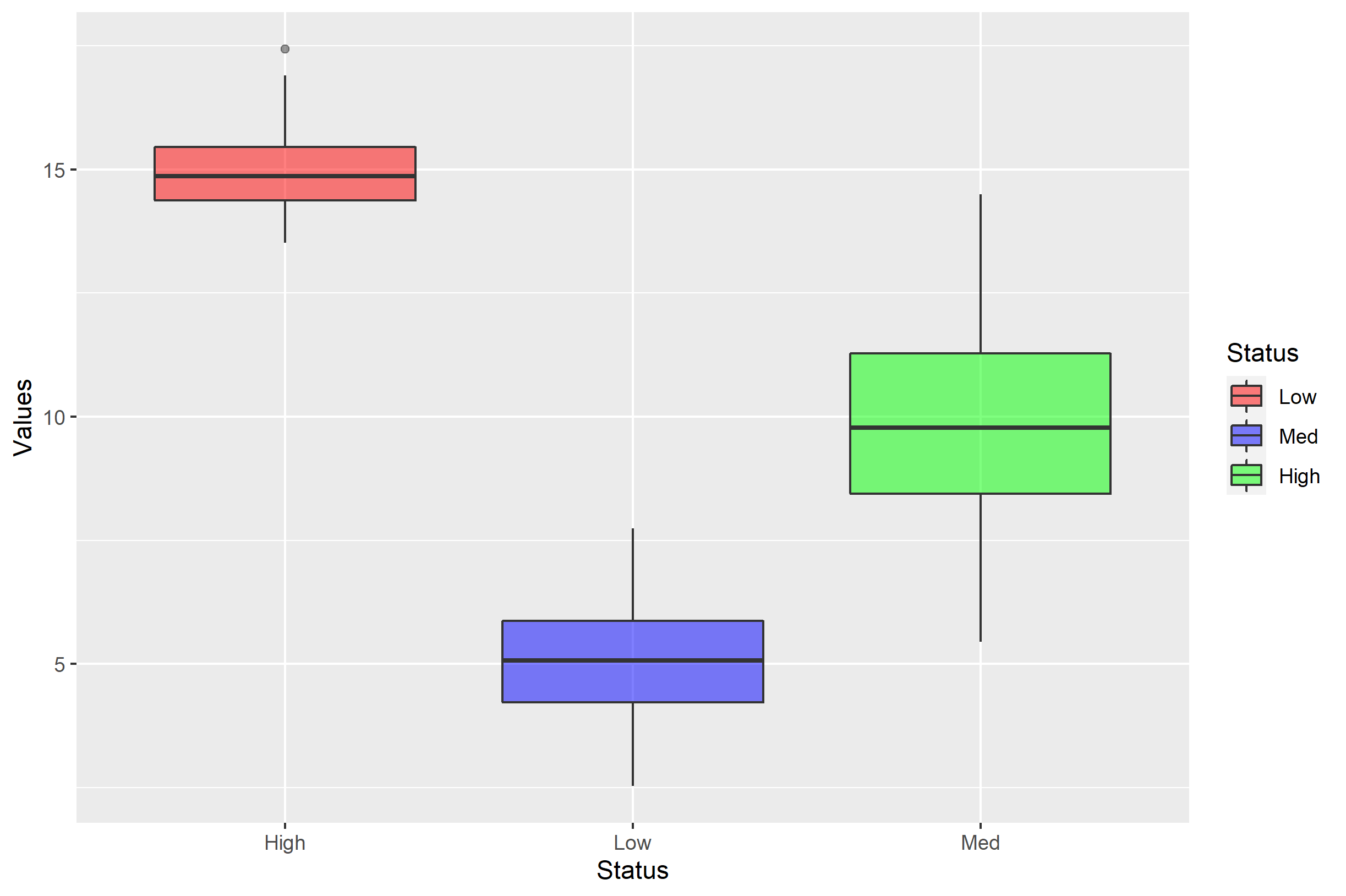 p <- ggplot(df, aes(Status,Values)) + geom_boxplot(aes(fill=Status), alpha=0.5)