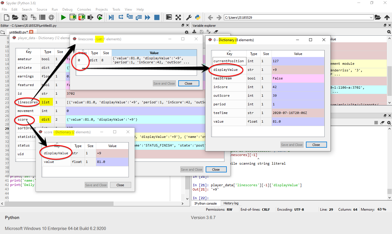 因此,在该player_data数据中(请参阅下面的图像以获得可视化),您需要转到['score']['displayValue']键。linescores也是如此。但是,注意linescores是一个列表,所以我怀疑每天他们都会附加最新的分数,因此,您需要调用列表中的最后一项。我也把它放进去了,但是我评论了一下