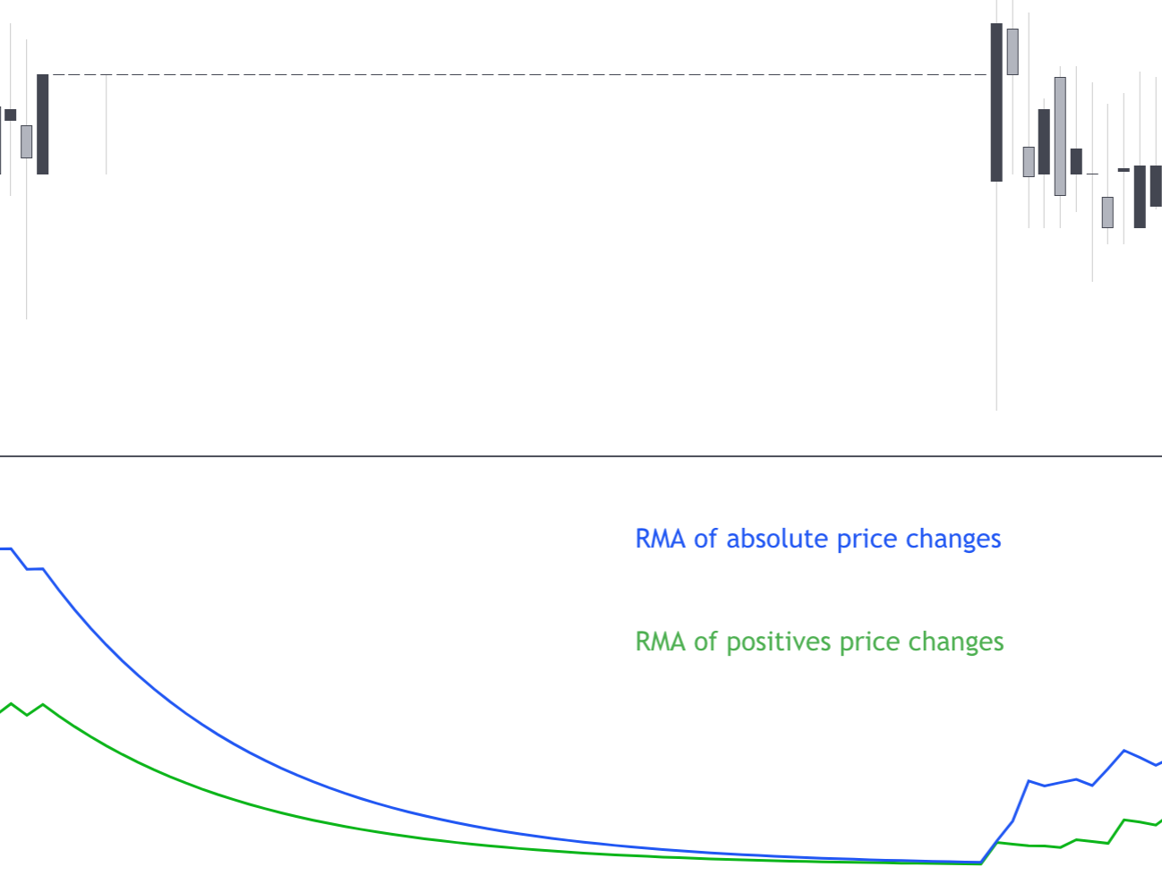 在图表中,在价格变化等于0的时期内,正价格变化的RMA值和绝对价格变化的值都呈指数衰减,但没有达到0(这是因为RMA是IIR滤波器)。