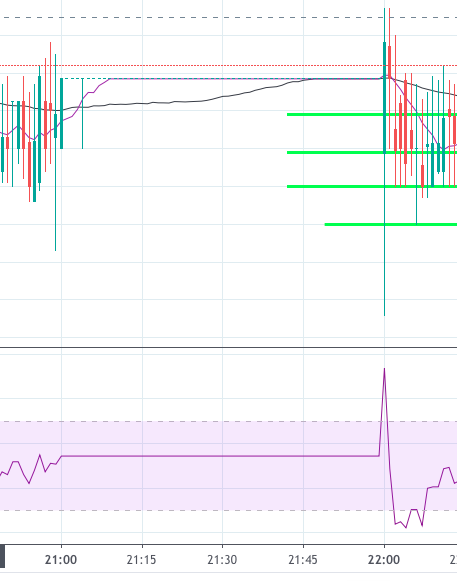 最近我一直在关注银的价值。我的问题是关于7月9日21:00-21:59白银美元/盎司(符号:银)的RSI指标。该小时的指示梯度为零。下面从TradingView复制的图表(1分钟)显示相同的开闭值,没有变化。有趣的是,在这段时期之后,白银被“超买”(超过70 RSI)。