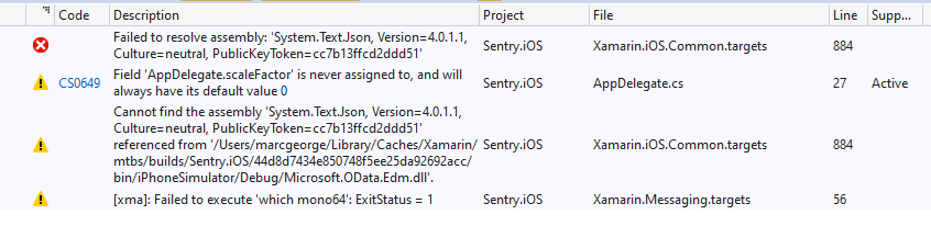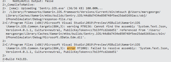 2>_CompileToNative: 2> xma:上传'Sentry.iOS.exe‘(36/36 KB) 100.00%./Library/Frameworks/Xamarin.iOS.framework/Versions/Current/bin/mtouch @/Users/marcgeorge/Library/Caches/Xamarin/mtbs/builds/Sentry.iOS/44d8d7434e850748f5ee25da92692acc/obj/iPhoneSimulator/Debug/response-file.rsp 2>C:\Program文件(x86)\Microsoft Visual Studio\2019\Preview\MSBuild\Xamarin\iOS\Xamarin.iOS.Common.targets(884,3):警告MT0136:无法找到程序集'System.Text.Json、Version=4.0.1.1、Culture=neutral、'/Users/marcgeorge/Library/Caches/Xamarin/mtbs/builds/Sentry.iOS/44d8d7434e850748f5ee25da92692acc/bin/iPhoneSimulator/Debug/Microsoft.OData.Edm.dll'.引用的PublicKeyToken=cc7b13ffcd2ddd51‘2>