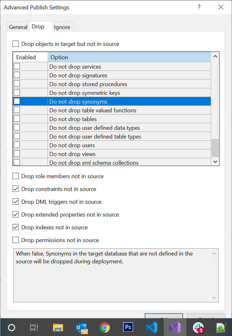 我可以在高级发布设置上看到ff,但是我们不想启用Drop objects in target but not in source。我们希望项目中的同义词不要在发布期间重新创建。