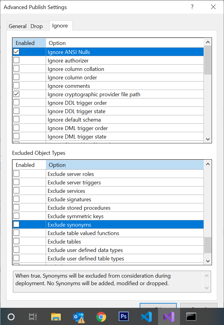 显然,如果我们想要使用命令行来实现这一点,那么/p:ExcludeObjectType=Synonyms是SqlPackage的一个选项。