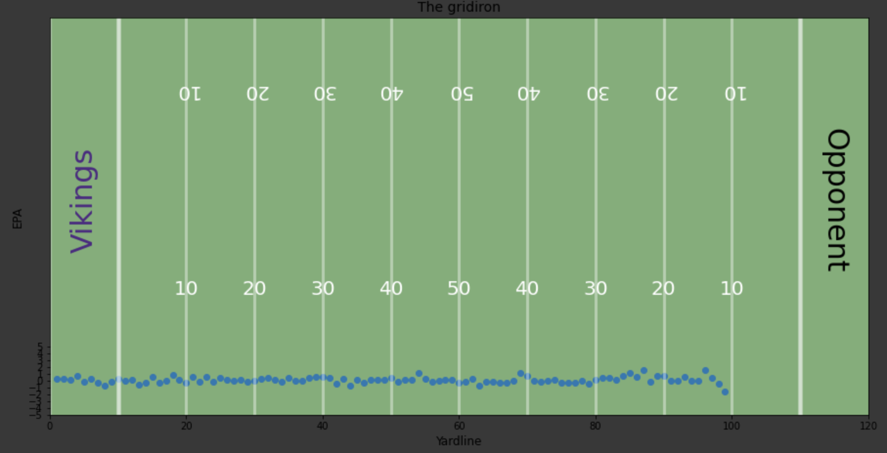 我想要创建一个NFL字段的小区,然后在其上放置一个散点图。这是我的字段代码(只需复制粘贴所有这些。这不是我的问题所在):