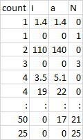 data = [["count","i","a","N"],