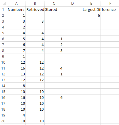 如果一个数字第一次大于以前的数字,则检索该数字(此实例中为3);如果在检索到的数字之后,后续数字小于或等于“检索到的数字- 1",则丢弃检索到的数字(3将被丢弃)(返回规则(I),选择数字4);如果后续数字大于检索到的数字,则存储后续数字与检索到的数字之间的差异,显示后续数字与检索到的数字之间的最大差异(在本例中为7-4)。