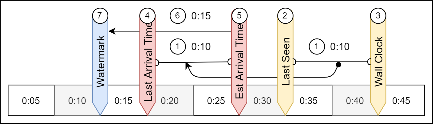 “当没有传入事件时,水印是当前估计到达时间减去延迟到达容忍窗口。估计到达时间是从上一次看到输入事件时经过的时间加上输入事件的到达时间。”