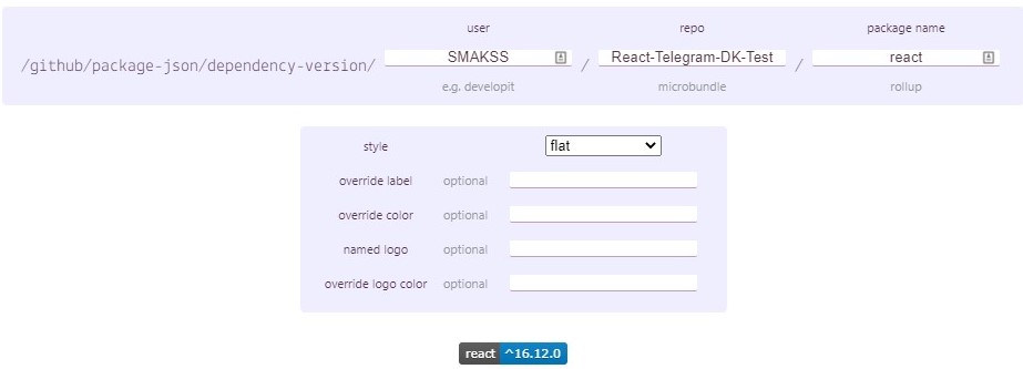 但是,如果您打算为您的项目依赖项创建标记(Shiels.io将为检查它们建立对等连接,并且每当它们被更新时就会更新它们),您必须使用平台和版本支持依赖项,这将使您能够从GitHub回购注入实时版本的依赖项。因此,例如,如果您的package.json存在于主回购中,您可以使用GitHub package.json依赖项版本(prod),那么只需在package.json中填充您的GitHub用户名、所需的回购和包名。因此,假设我想得到我的react版本的反应-电报-DK-测试回购,存在于我的用户名。我可以这样做:
