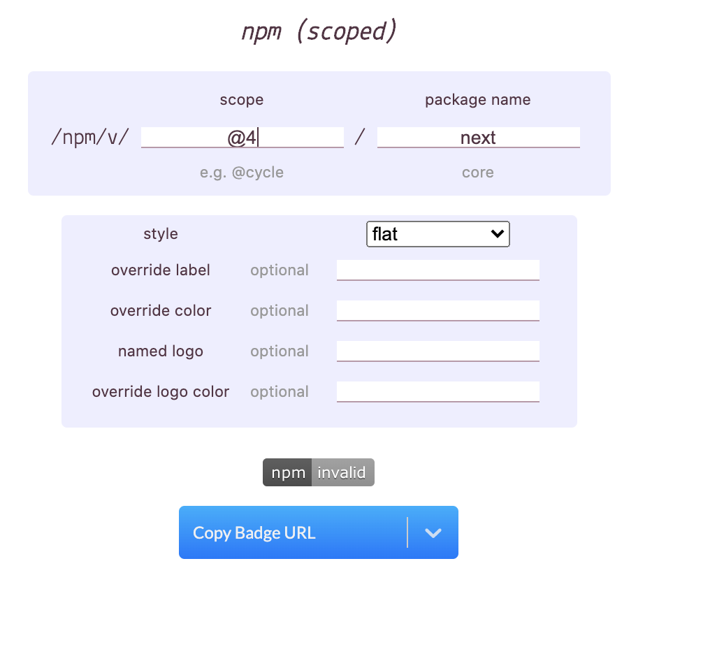 实际上,npm (作用域)徽章将自动从npm服务器注入最新版本的npm包。因此,您只需填写必要的数据,即作用域名称(如果使用的话)和包名,它将转换为类似于此@somescope/somepackagename的内容,它将在npm服务器中搜索它的最新公开版本。