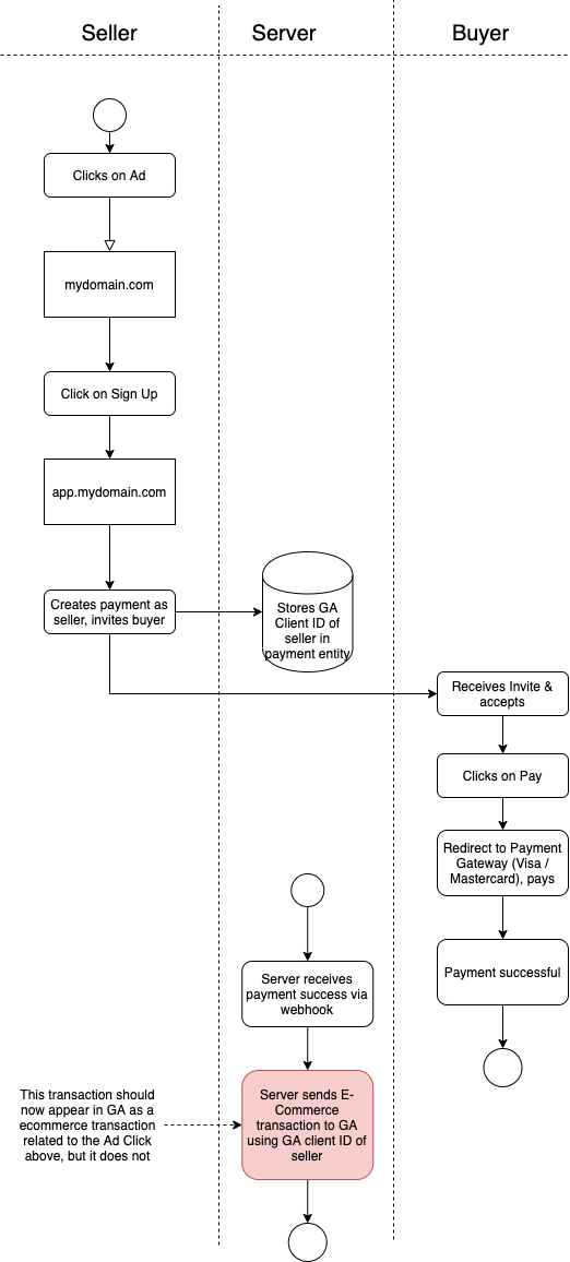 我们有一个支付系统,可以让买家安全地向卖方付款,我们还可以获得一定比例的支付额(类似于PayPal)。一旦成功,我们就能拿到我们的费用。因为我们的用户也可以通过银行电汇付款,所以我们可能需要一两天才能真正得到我们的费用。这就是为什么电子商务交易不是从前端发送到GA (就像在线商店中的感谢页面),而是在付款成功后直接从我们的服务器发送到GA。