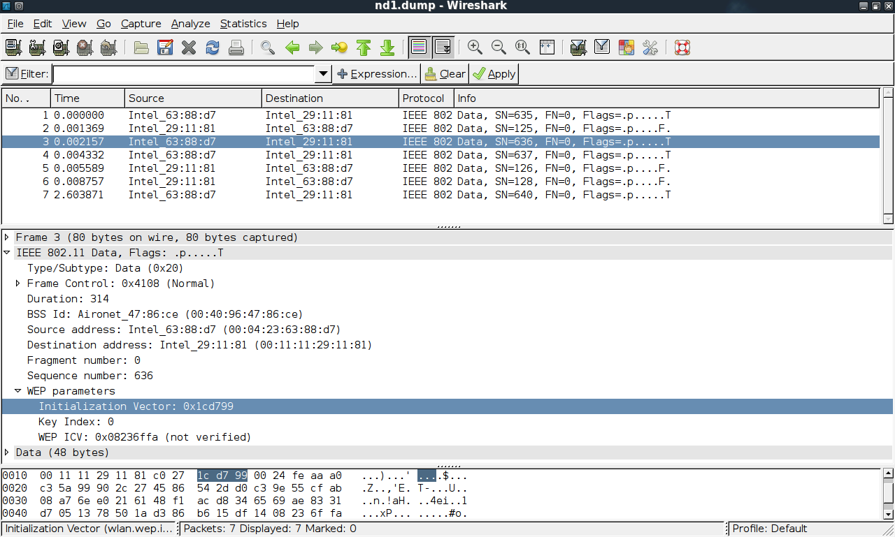 因此,如果IV是以明文发送的,并且假设IV是24位(相当于3个ASCII字符(例如AB3) )。因此,我可以在Wireshark捕获的数据包中看到一个IV值(在IEE802.11 -> WEP参数下的截图)。在屏幕截图中,一个特定的网络WEP数据包显示的IV值为0x1cd799 (假设这是十六进制格式?)。我试着在十六进制中将这个值转换成ascii转换器,但是在转换中得到了错误?