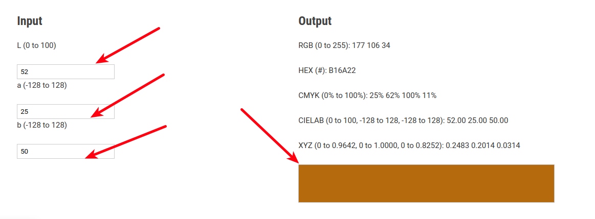 >>> colour.convert([52. / 100., 25. / 100., 50. / 100.], 'CIE Lab', 'Output-Referred RGB') * 255